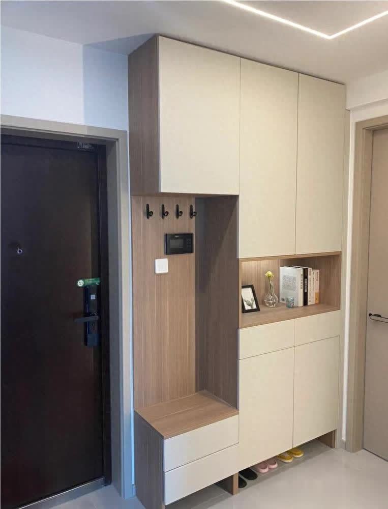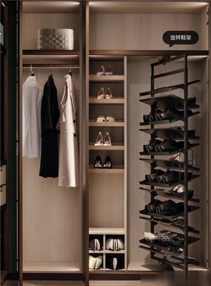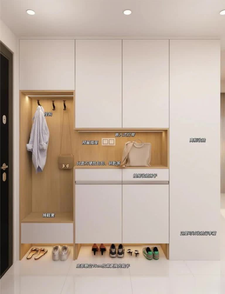 其实正确的做法是在 入户门旁边设置换鞋凳,上面配合上衣挂钩,方便放置外套、帽子等出门常穿的衣物,实用性更强,并且在换鞋凳旁边再配合鞋柜,进门后就会觉得整洁,而且用到鞋柜的时候也比较方便; 如果鞋柜放在玄关后面,出门时要进门时就需要绕道,效率反而低了。